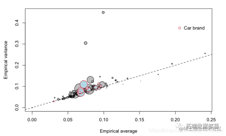 在右边,我们可以观察到年轻的(没有经验的)驾驶员。那是预料之中的。但是有些类别 低于 第一个对角线:期望的频率很大,但方差不大。也就是说,我们 可以肯定的 是,年轻的驾驶员会发生更多的车祸。相反,它不是一个异类:年轻的驾驶员可以看作是一个相对同质的类,发生车祸的频率很高。