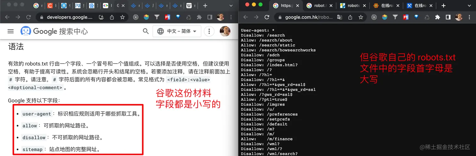 - PS:谷歌这份材料里面字段用的是小写,但百度的材料以及谷歌自己的 robots.txt 文件 都是首字母大写,暂时不确定有没有区别,不过我用的是首字母大写的格式