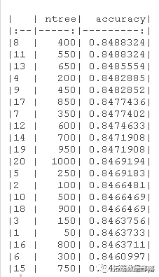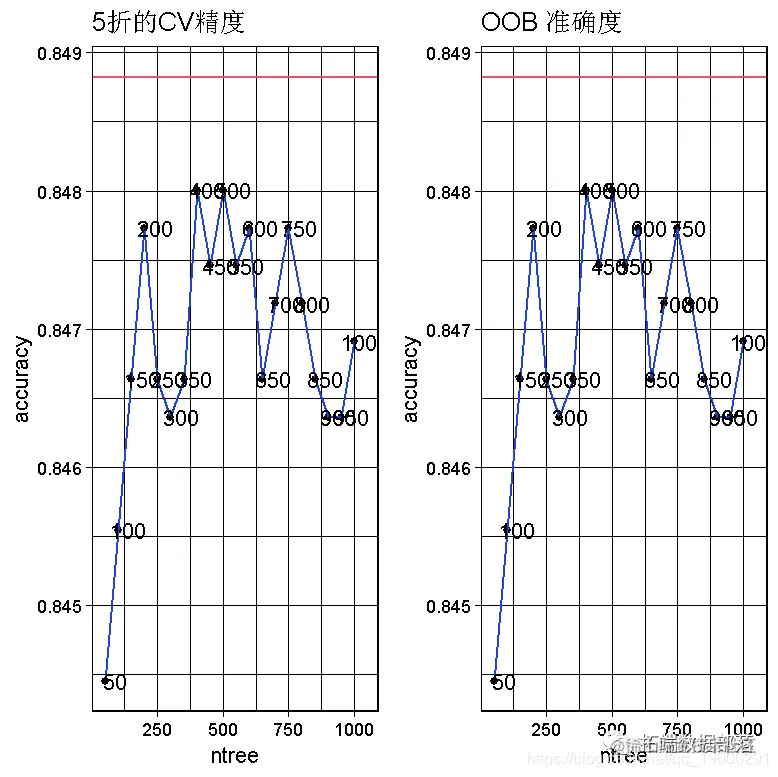 我们可以看到,在50到1000棵树的范围内,RandomForest模型的最高精度可以通过设置CV方法的树数等于400来获得。图中的红线显示了我们从逻辑回归模型实例中得到的最佳CV精度。由于OOB的最高准确率高于CV的最高准确率,所以我选择了CV的准确率,使其更加谨慎。ntree=400的CVaccuracy=0.8486CVaccuracy=0.8486,比最好的逻辑回归模型差0.00020.0002! 然而,如果我们考虑OOB的准确性,那么RandomForest模型比最佳逻辑回归模型好0.00120.0012。