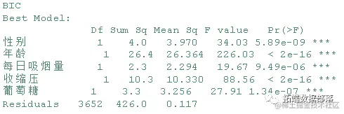 基于BIC的bestglm::bestglm()将模型变量减少到5个:男性、年龄、cigsPerDay、sysBP和葡萄糖。所有的变量都是非常显著的,正如预期的那样。