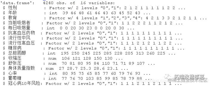 该数据集是FHS数据集的一个相当小的子集,有4240个观测值和16个变量。这些变量如下: