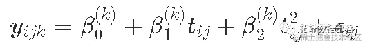 模型 E:随机二次 - 跨类的共同方差结构 允许个体在类内通过初始权重变化,但是假设每个类具有相同的变异量。对于 k=1:K, 类, 对于个体 i, 在时间点 j, tj,