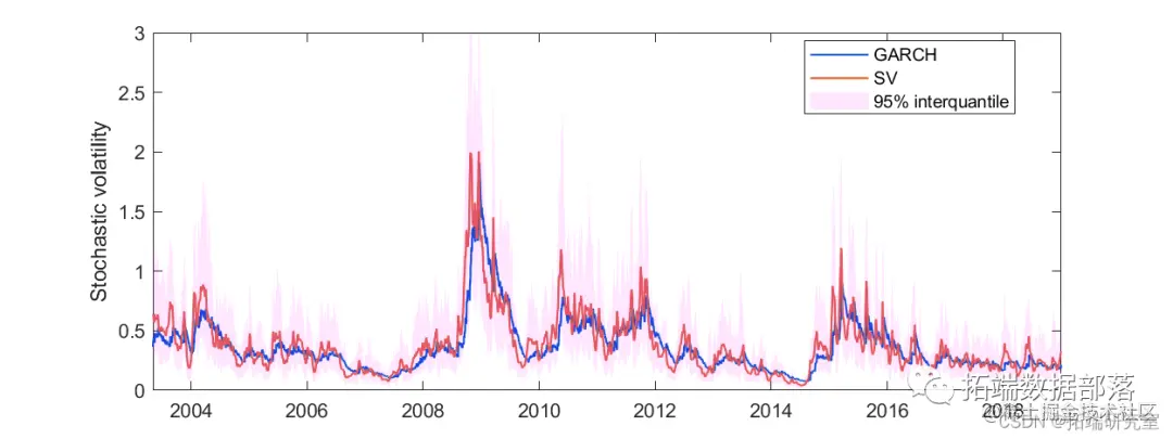SV 模型的随机波动性总体上与 GARCH 模型非常相似,但更加参差不齐。这是很自然的,因为 SV 模型中假设了额外的随机项。与其他模型相比,使用随机波动率模型的主要优点是波动率被建模为随机过程而不是确定性过程。这使我们能够获得序列中每个时间的波动率的近似分布。当应用于波动率预测时,随机模型可以为预测提供置信度。另一方面,不利因素也很明显。计算成本相对较高。