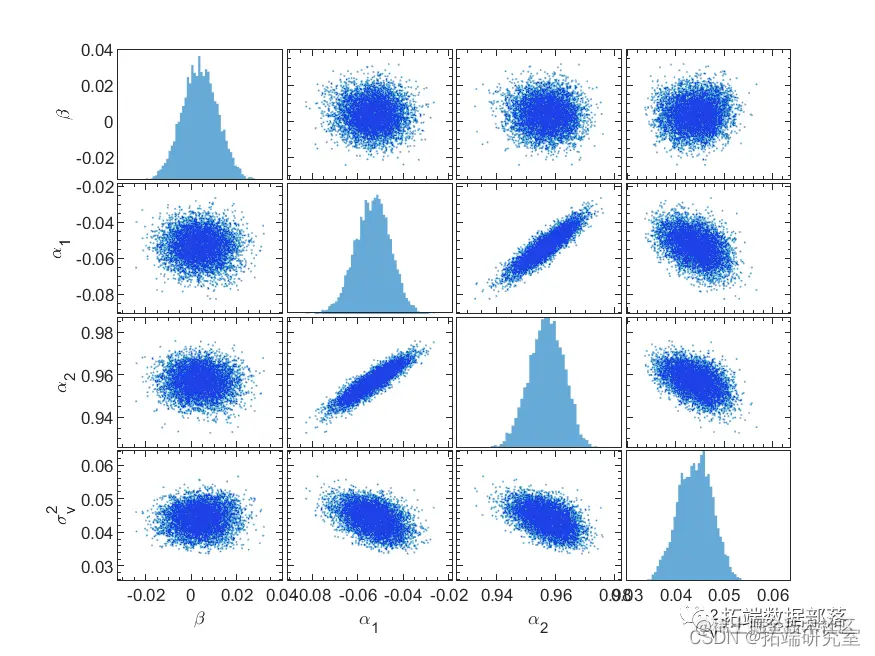 去除burin-in后,我们从参数的真实高维联合分布中得到可以近似随机抽取的样本的参数样本集合。然后我们可以对这些参数进行统计推断。例如,成对参数的联合分布和每个参数的边际分布如图 9 所示。我们可以用联合分布来测试这个说法。显然与其余参数不相关。正如预期的那样,并且高度相关,使用它们的联合后验分布来证明采样的合理性。为了提高采样效率,降低序列中样本的相关性,我们可以通过采样改进上述算法,并从它们的三元联合后验分布。然而,如果不是完全不可能的话,为不同先验分布的变量计算出一个紧密形式的后验分布是很麻烦的。在这种情况下,Metropolis-Hastings 抽样方法肯定会发现它的优势。