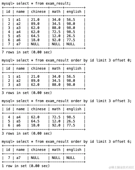 SELECT id, name, math, english, chinese FROM exam_result ORDER BY id LIMIT 3 OFFSET 6;