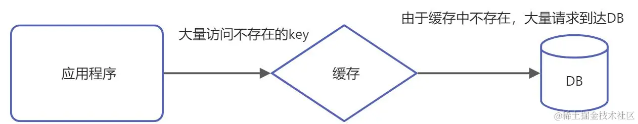 正常情况下,访问数据先去缓存中,如果缓存中没有,再去DB,然后维护缓存,下次同一个key过来时,就可以直接从缓存中读取,从而减小了DB的压力。但是,如果访问了一个不存在的key的数据,缓存中也没有,DB中也没有,后续如果一直访问就达不到减少DB压力的目的,数据访问过程一直是缓存-->DB。这就是缓存穿透。