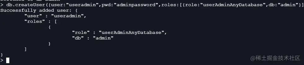 db.createUser({user:"useradmin",pwd:"adminpassword",roles:[{role:"userAdminAnyDatabase",db:"admin"}]})