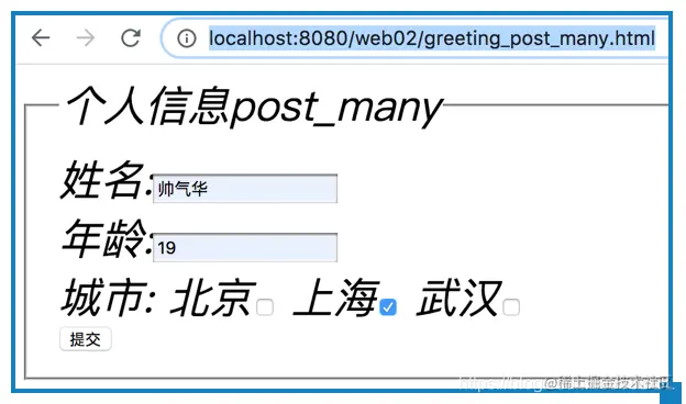然后在谷歌浏览器上输入地址:http://localhost:8080/web02/greeting_post_many.html