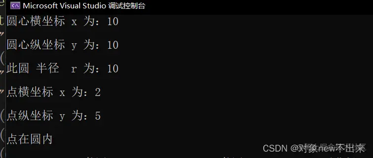数学上点和圆的关系是圆心到点的距离和半径的比较,这里我把等号两边平方,比较两个数据的大小即可;若距离大于半径,点在圆外;距离等于半径,点在圆上;距离小于半径,点在圆内;relative 函数传入Circle 类和 Point 类的对象,分别计算圆心到点距离的平方 distance和半径的平方 rDistance,利用多重If语句输出不同结果即可。