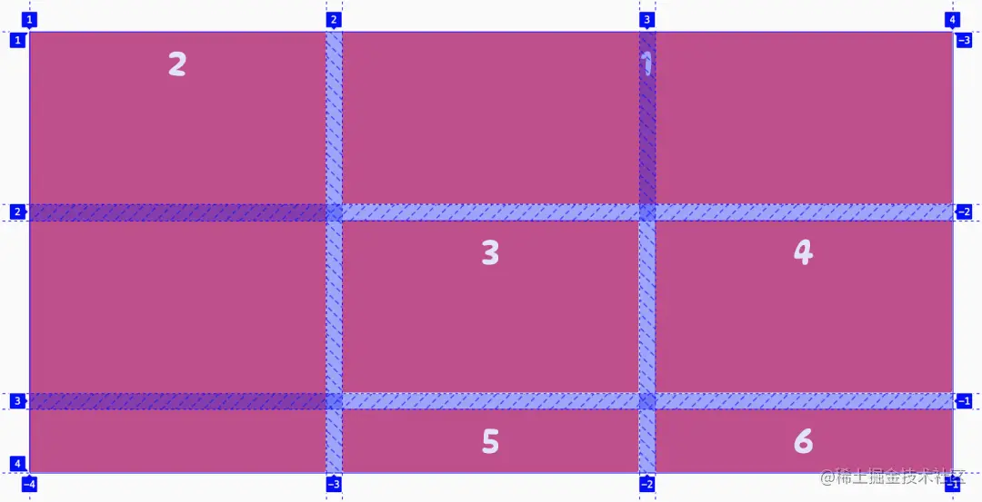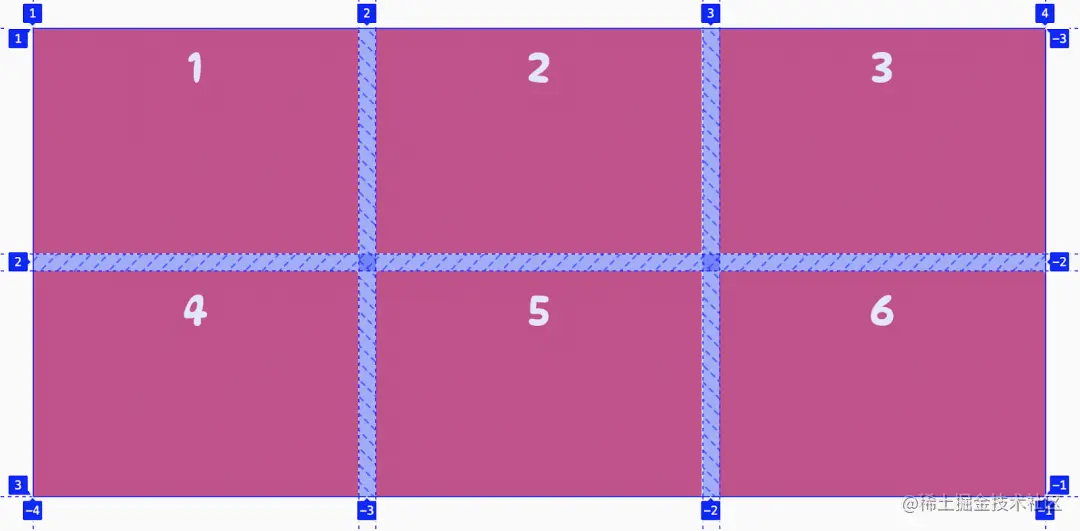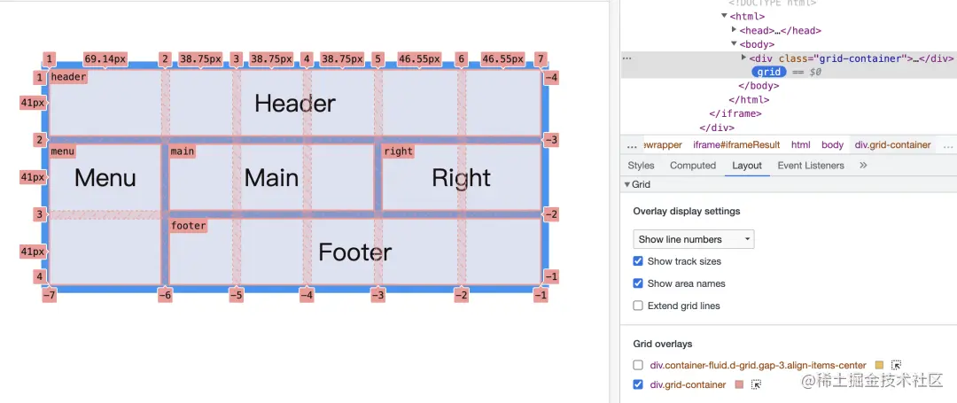 点击这个 grid 标志,页面的 grid 网格就会显示数网格区域以及网格线,并且会为网格线进行编号,如下: