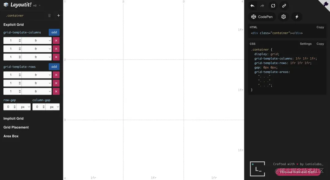 最后来分享2个实用的 CSS Grid 生成器。通过这些生成器,可以可视化得调整 Grid 布局,最终会拿到生成的 Grid 布局代码。