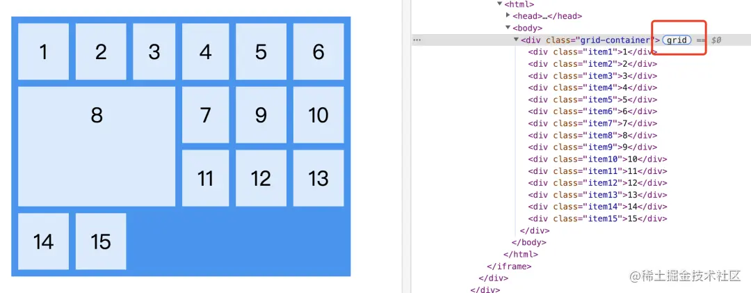上面我们介绍了如何定义 CSS Grid 布局,那该如何调试呢?Chrome DevTools 支持对 Grid 布局进行提示。如果一个元素是 Grid 布局,在 DevTools 的 Elements 面板中,Grid 布局的容器元素上就会显示一个 grid 的标识,如下: