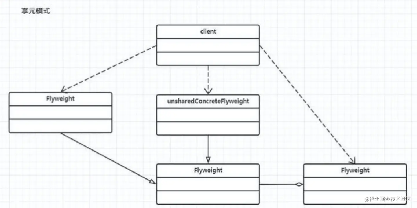 - 具体享元(Concrete Flyweight)角色 :实现抽象享元类,称为享元对象;在具体享元类中为内部状态提供了存储空间。通常可以结合单例模式来设计具体享元类,为每一个具体享元类提供唯一的享元对象。