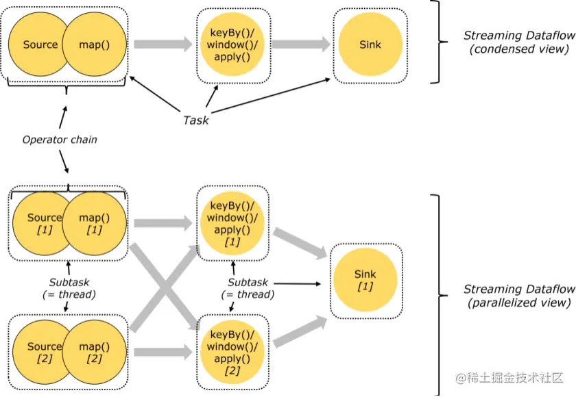 比如一个执行操作map,分布式的场景下会在多个线程中同时执行,每个线程中执行的都叫做一个SubTask(在第3节的图中也能够体现)