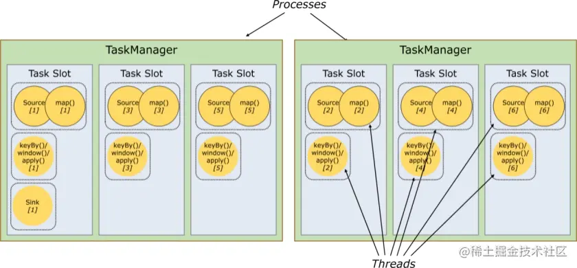 - TaskManager最多能同时并发执行的任务是可以控制的,那就是3个,因为不能超过slot的数量