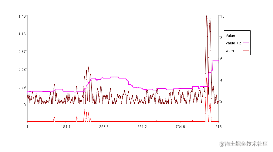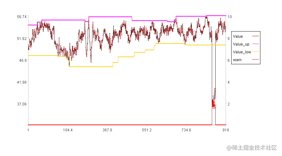 图中Value是数据,Value_up是动态上限,Value_low是动态下限,warn是异常度。从图中可以看出,算法准确发现了值过小的异常。