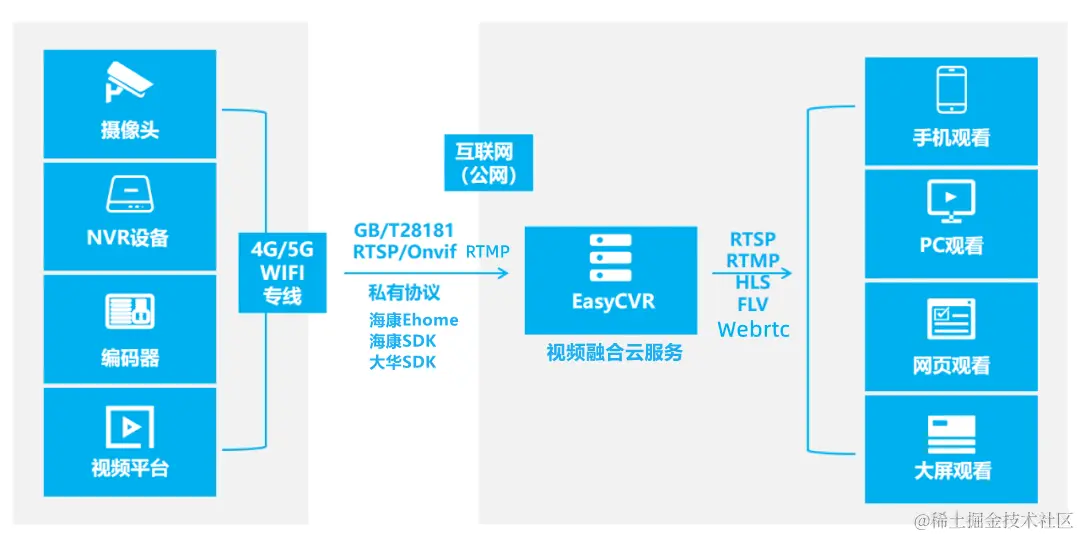 EasyCVR视频融合云平台可支持多协议、多类型的设备接入,包括国标GB28181、RTSP/Onvif、RTMP协议,以及海康/大华SDK、海康Ehome等,对外可分发RTSP、RTMP、FLV、HLS、WebRTC等格式的视频流。平台支持海量视频汇聚管理,可以提供视频监控直播、录像、云存储、检索与回看、智能告警、语音对讲、服务器集群、平台级联、数据共享等能力。