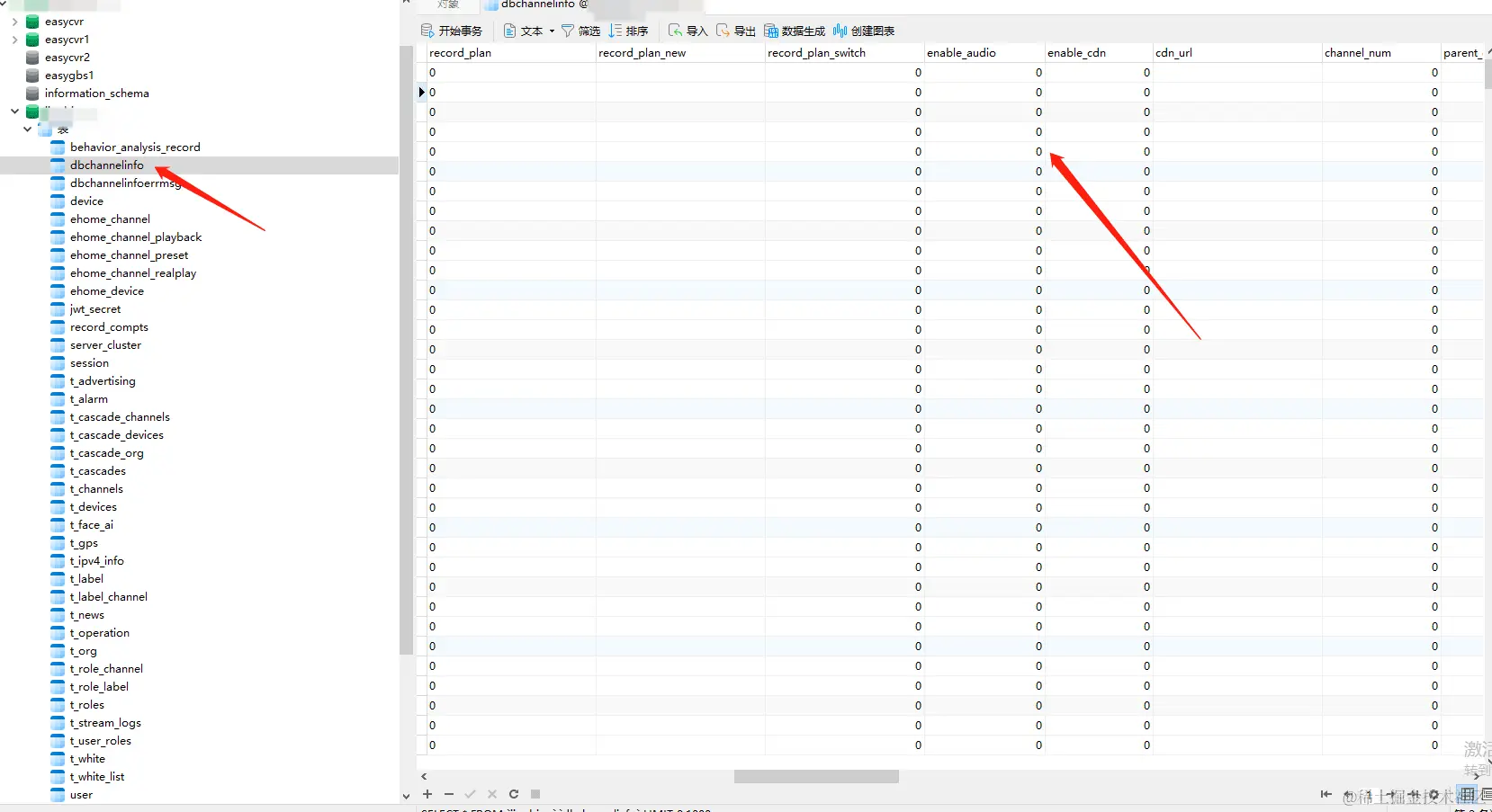 1)首先,打开EasyCVR的数据库,找到dbchannelinfo表: