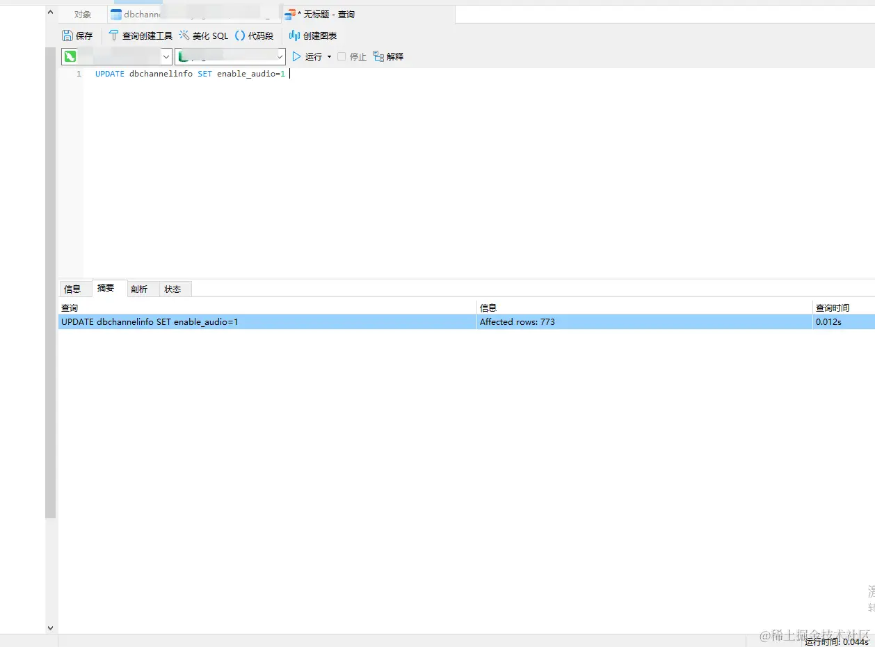 3)使用SQL语句将所有的enable_audio改成1即可,在SQL查询页面输入UPDATE dbchannelinfo SET enable_audio=1,如图: