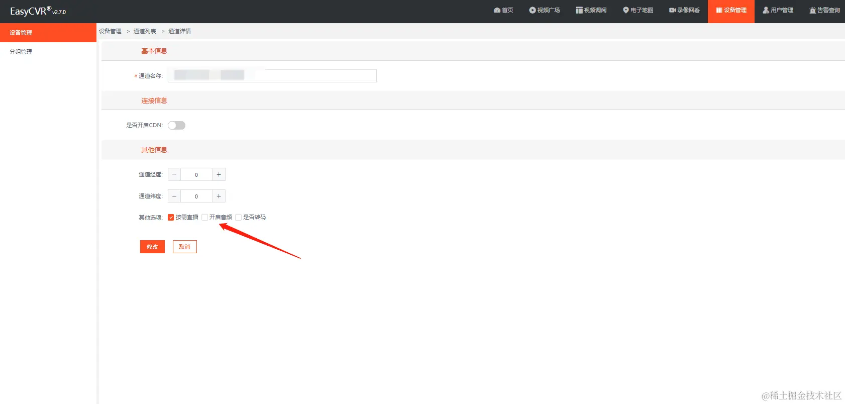 有用户咨询,使用EasyCVR时,需要将通道的音频打开,但是目前在EasyCVR中没有批量开启音频的设置。在通道接入数量比较小的情况下,可以手动逐个配置,如下图: