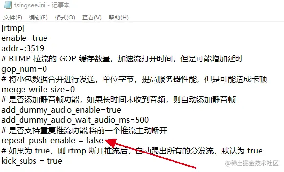 如有用户有类似的重复推流需求,可以在/mediaserver/tsingsee.ini文件中找到 repeat_push_enable,将值改为true。