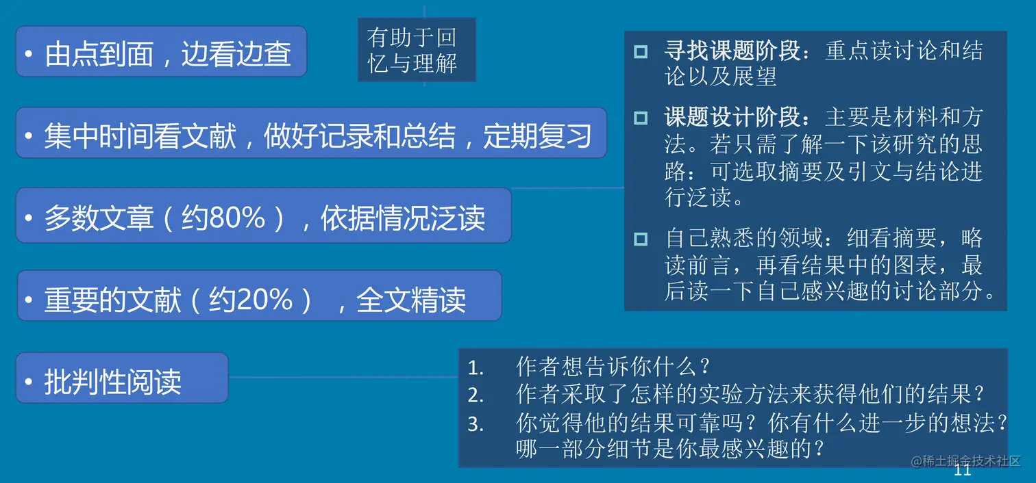 3.10.4 在课题组内做文献阅读报告时, 应提炼哪些内容, 与推荐的阅读顺序思路相似吗? 研究型文献和综述型文献分别侧重什么? 是否需要每次找很多篇同类文章?