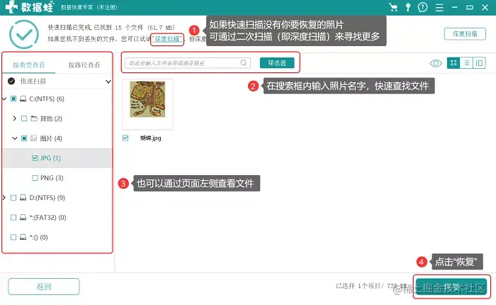 额外操作:如果快速扫描没有你要恢复的照片,就通过二次扫描(即深度扫描)来寻找更多。扫描时间稍久,没有特殊情况的小伙伴可以忽略这步。