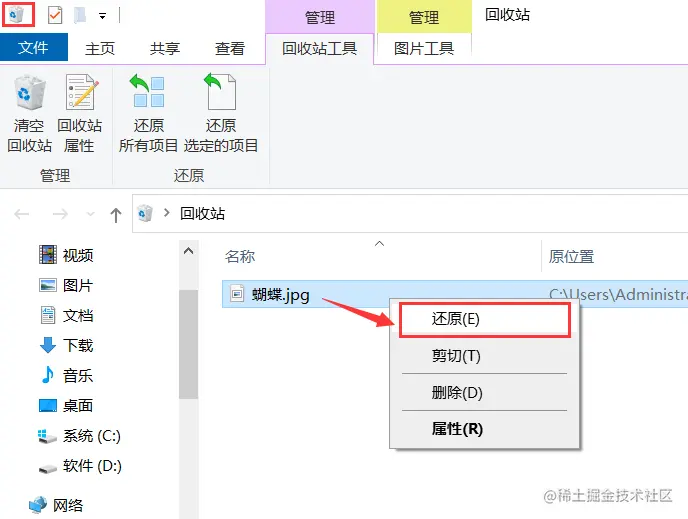 除非永久删除,电脑删除的照片一般都会经过回收站。回收站删除的照片怎么找回?打开电脑的回收站,你可以看到要恢复的照片,选中照片,右键快速还原。