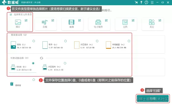 主要操作:打开软件界面,根据自己的情况选择文件类型和文件保存的位置。例如:在文件类型里单独选择照片(要是想要扫描更全面,新手建议全选),文件保存位置选择C盘、D盘或者E盘(即照片之前保存的位置)。选择好后,开始扫描。