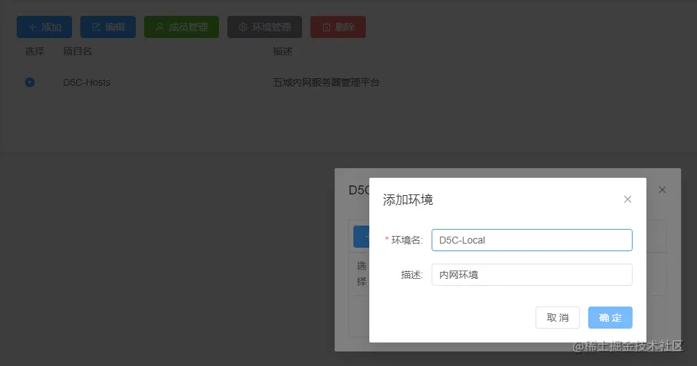 【添加环境】 :项目管理-项目列表-勾选项目-环境管理-添加环境-输入环境名及描述-确认(后面添加数据库时会用到)