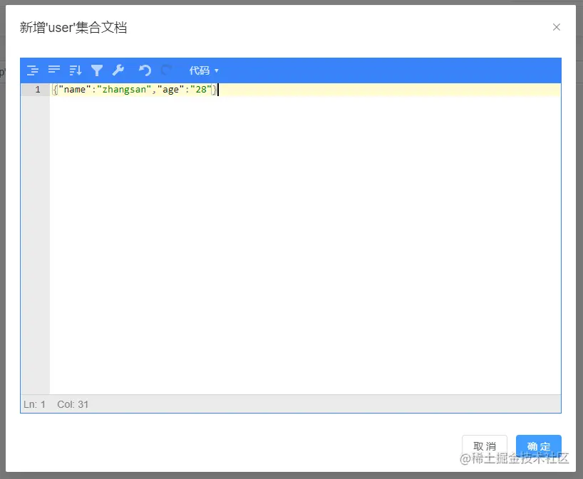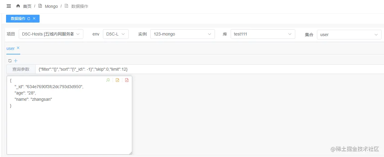 【数据操作】:Mongo-Mongo操作,依次选择项目、env、实例、库、表,例如:我想往test111数据库的user表中插入一条数据,内容如下: