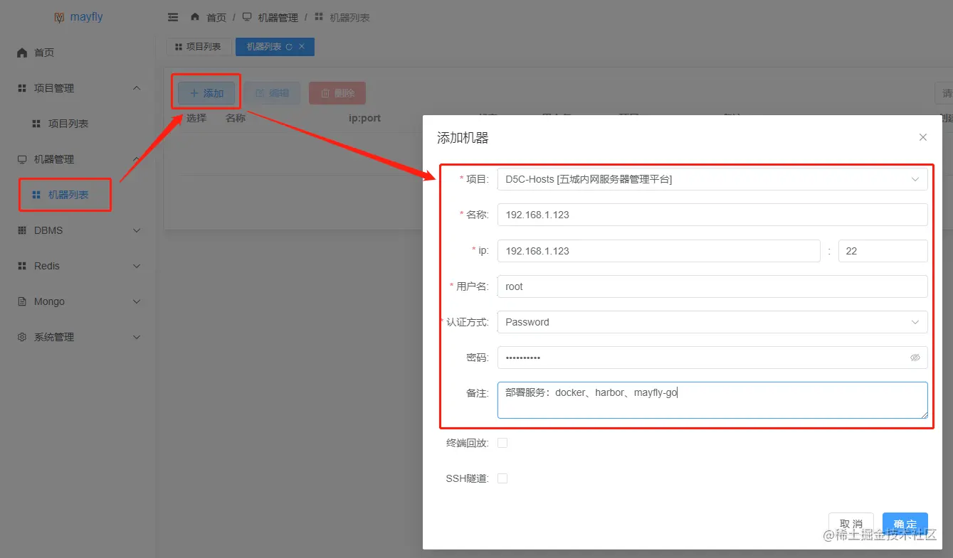 机器管理-机器列表-添加-输入机器相关信息-确认