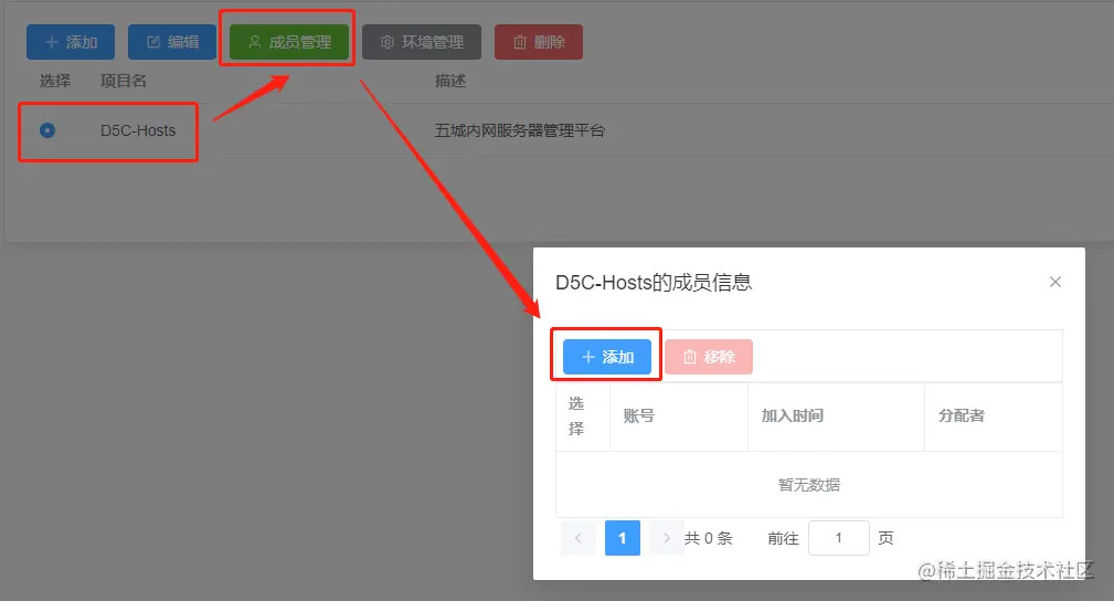 【项目添加成员】 :项目管理-项目列表-勾选项目-成员管理-添加-搜索成员-选择成员-确认