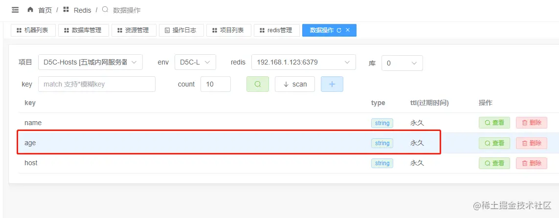 【数据操作】: Redis-数据操作,依次选择项目、env、redis、库,例如我想添加一个名称为age的key:
