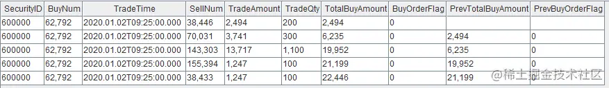 上述代码对股票代码为60000的逐笔成交数据按照卖单订单号38446, 70031, 143303, 155394, 38433进行合并计算,在响应式状态引擎中对每一笔输入都会进行一次响应计算,所以输出结果的条数和输入记录的条数相等。结果表中的TotalSellAmount, SellOrderFlag, PrevTotalSellAmount, PrevSellOrderFlag分别代表每一条成交记录所代表的股票按照此记录的卖单订单号合并后的累计成交金额、当前成交记录合入后根据累计成交量判断的大小单标签、当前成交记录合入前的累计成交金额、当前成交记录合入前根据累计成交量判断的大小单标签,这些有状态因子的计算都是通过流式增量计算的方法实现的。