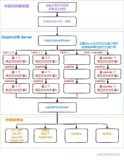 parallel参数是指流计算的并行度,上述代码中是创建了parallel个响应式状态引擎3,这些响应式状态引擎3的输入是对应的parallel个响应式状态引擎2的输出,实现并行计算。这些响应式状态引擎3的计算逻辑相同,但是处理的股票不同。 -