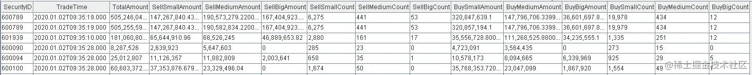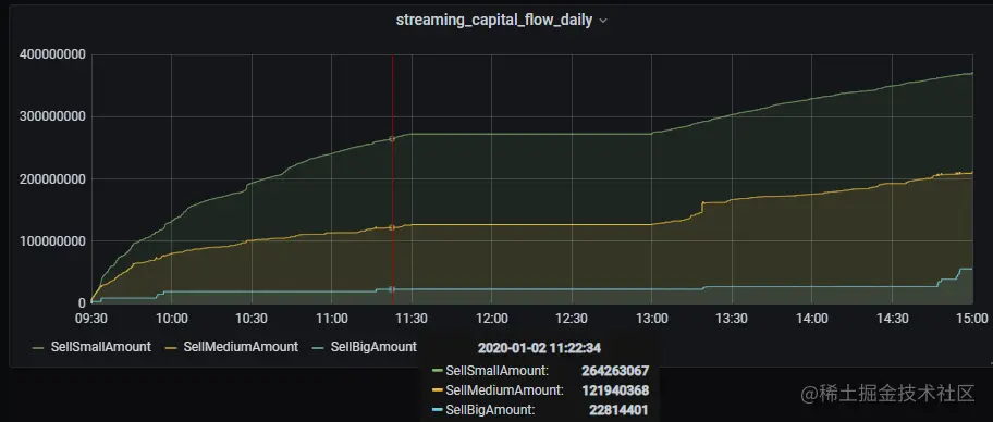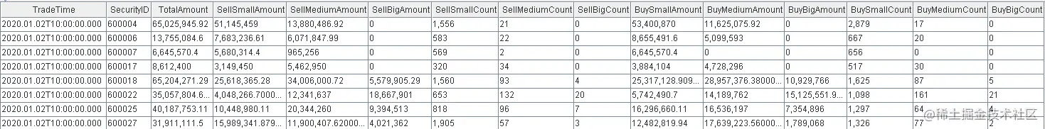 结果表中的BuySmallAmount, BuyMediumAmount, BuyBigAmount, BuySmallCount, BuyMediumCount, BuyBigCount表示买方向的日累计资金流指标,与卖方向的计算逻辑相似,不在展开阐述,也是通过响应式状态引擎和dynamicGroupCumsum, dynamicGroupCumcount函数实现流式增量计算的。