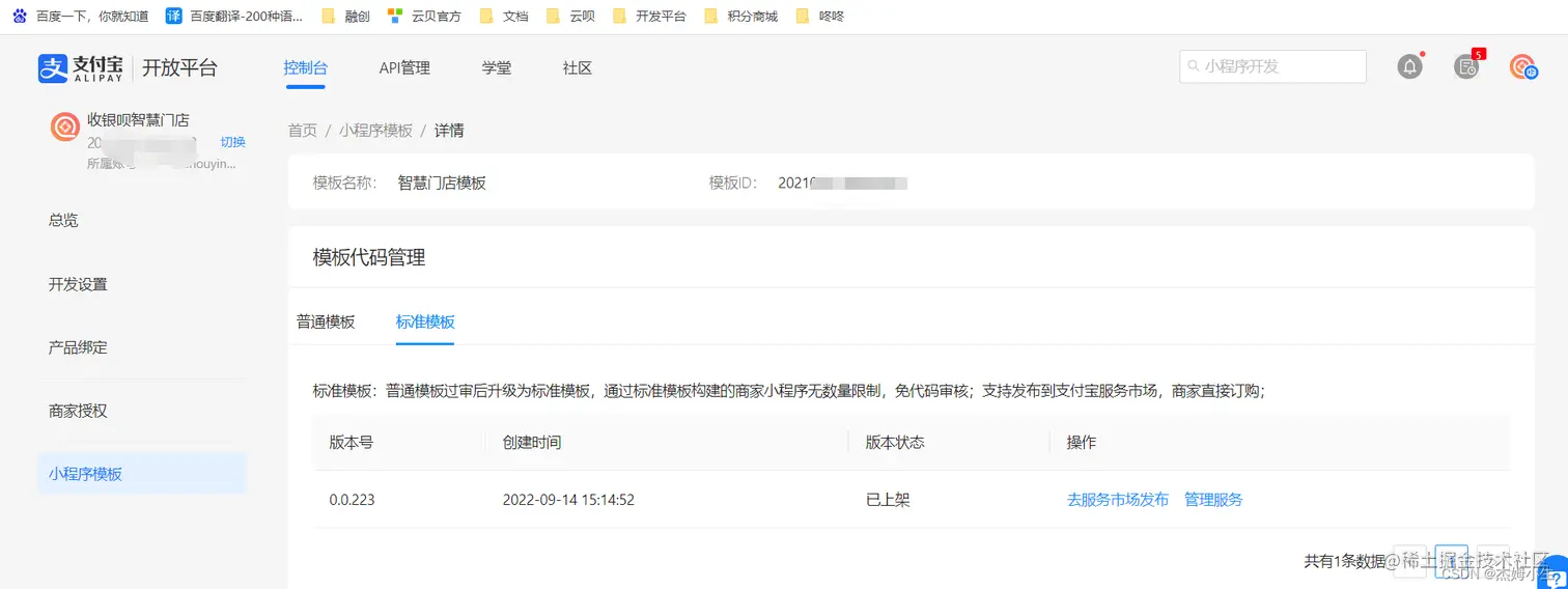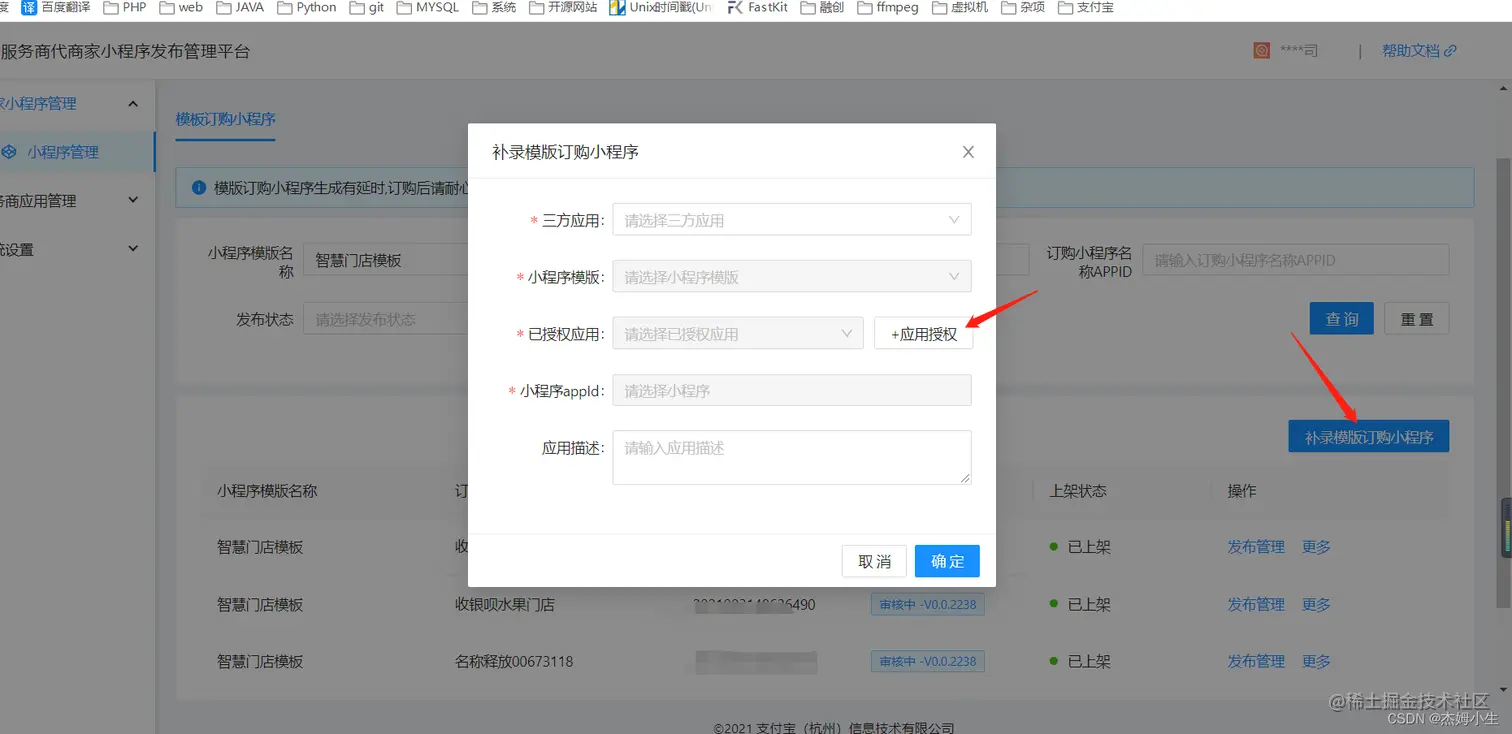 5.2点击授权模板 进入到这里 把 在应用市场购买的创建的小程序授权到这里 然后就可以发布了