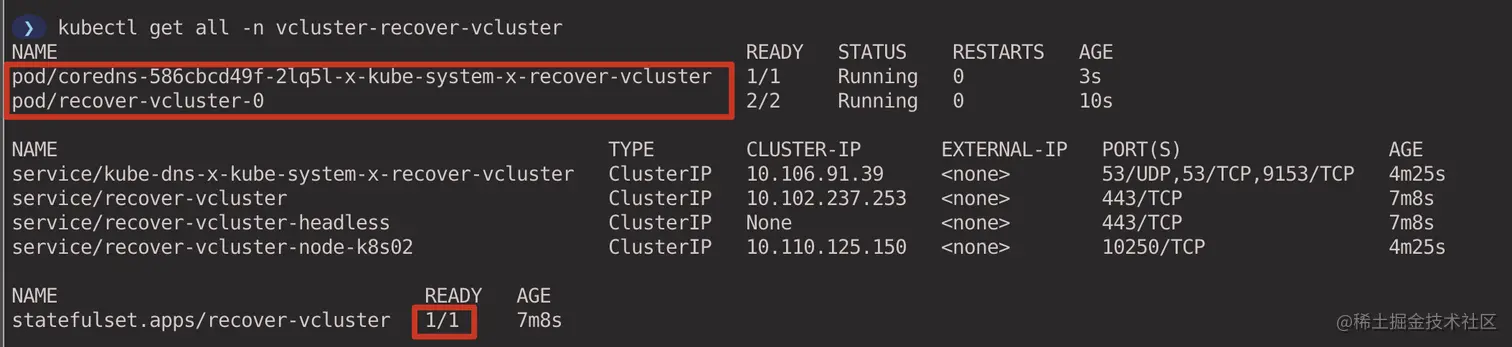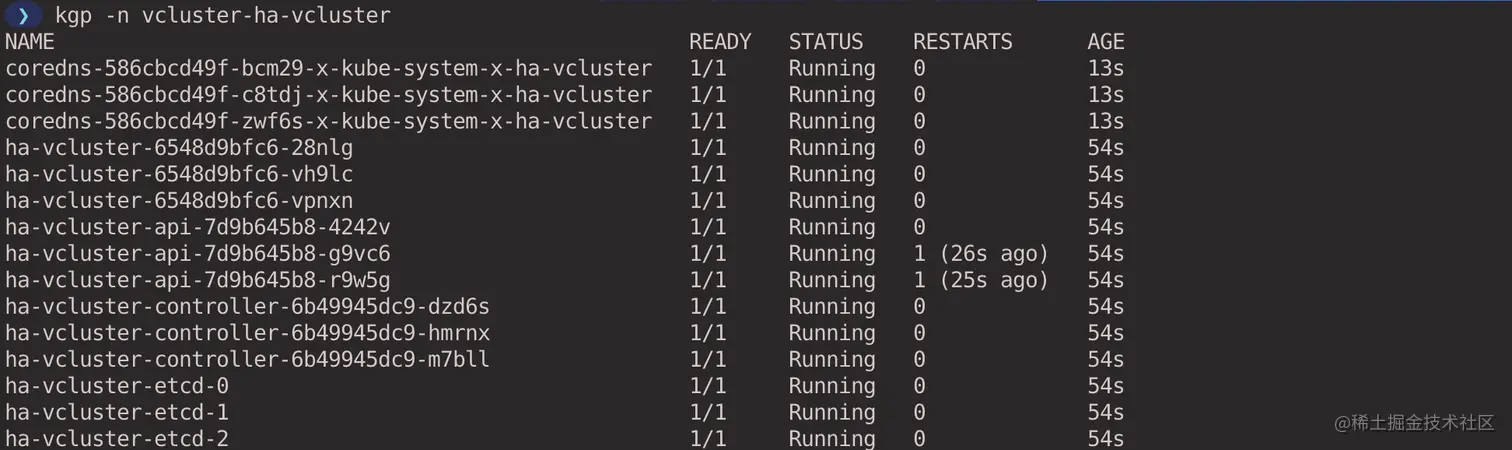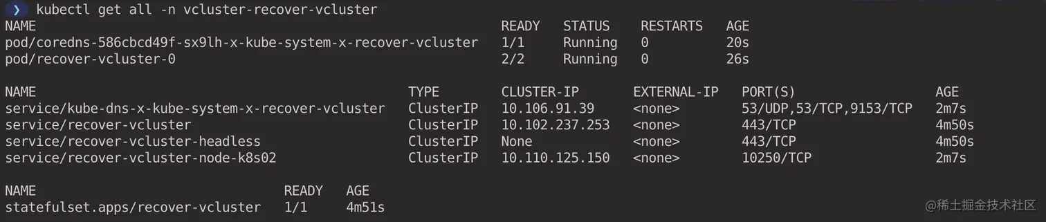 最简单的方式就是在创建虚拟集群的时候指定 --expose 参数,vcluster 会创建 LoadBalancer 类型的 Service 暴露虚拟集群(前提要有公有云托管的 Kubernetes 集群支持 LoadBalancer)。等待虚拟集群创建完成后,vcluster 会自动帮我们切换到虚拟集群的 kubeconfig context 中,此时可以直接通过 kubectl 命令行访问虚拟集群。
