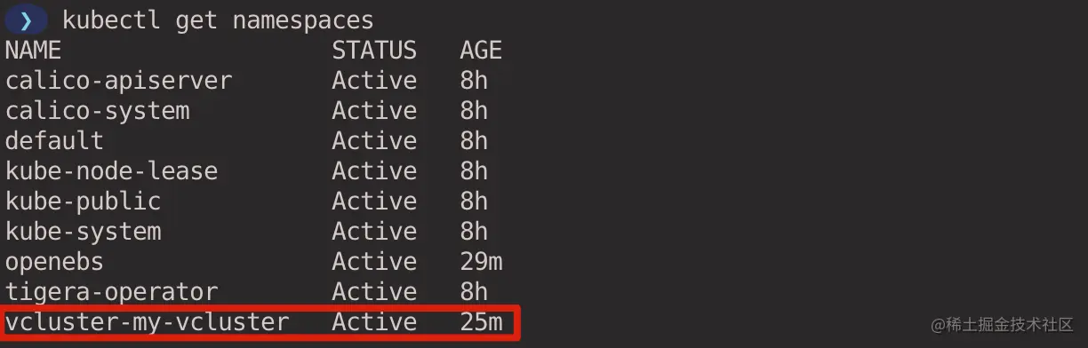 在宿主集群查看 Namespace,并没有看到在虚拟集群中创建的 demo-nginx Namespace,因为该 Namespace 只存在于虚拟集群中。
