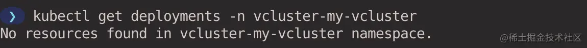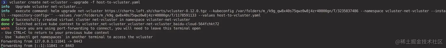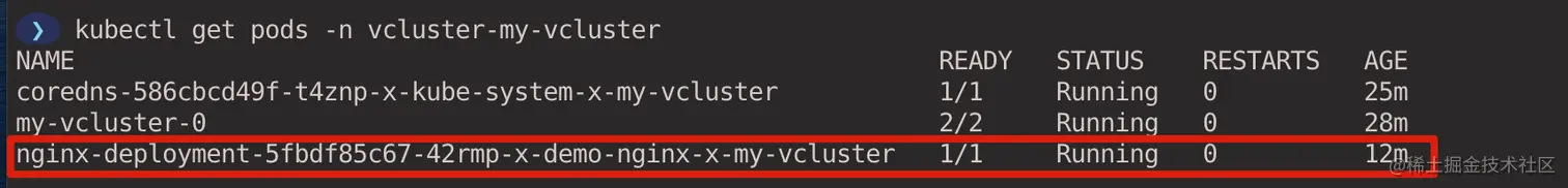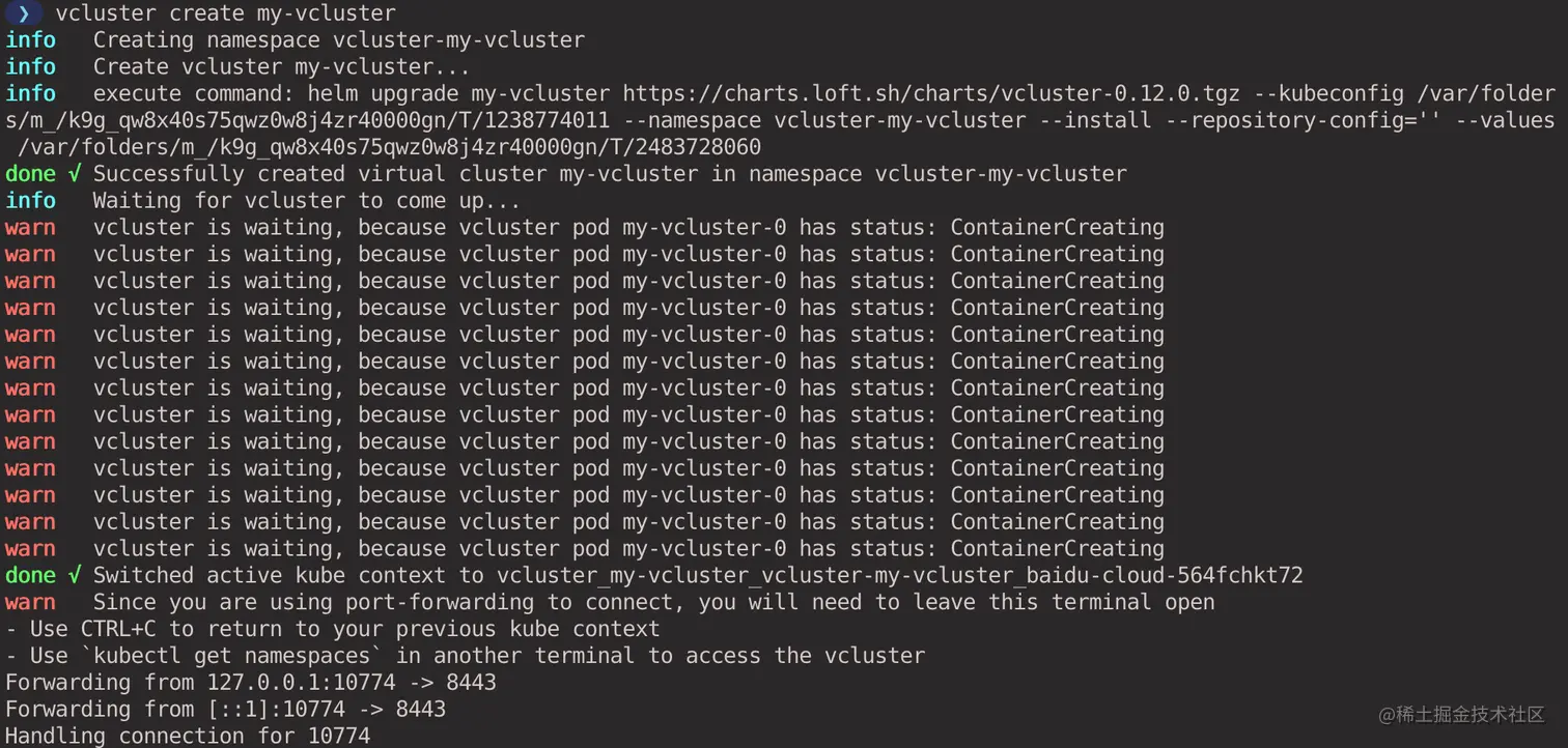 虚拟集群创建成功后,vcluster 会自动帮我们通过端口转发连接到虚拟集群。如果使用 kubectl 或者 helm 的方式安装虚拟集群,则可以使用 vcluster connect <cluster-name> 命令手动连接到虚拟集群。