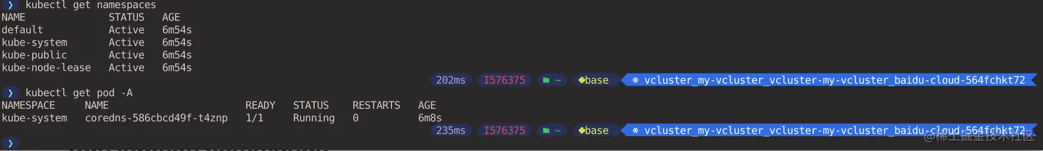 打开另一个窗口执行 kubectl 命令查看 Pod 和 Namespace,可以看到这是一个全新的集群,并不能看到虚拟集群所属的 vcluster-my-vcluster Namespace,因为该 Namespace 存在于宿主集群中。