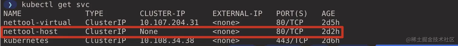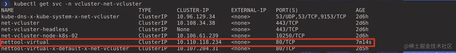 此时在虚拟集群中就能看到在宿主集群中的 nettool-host Service 了。(在虚拟集群 context 中执行)