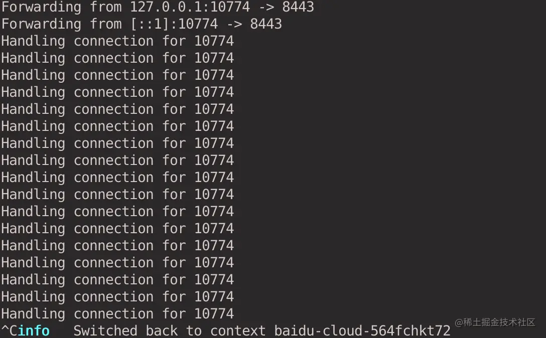 键盘按 ctrl + c 断开和虚拟集群的连接,kubectl 的上下文会自动切换回宿主集群。