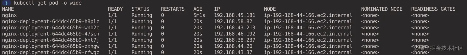 查看 Pod 的分布情况,可以看到所有的 Pod 都调度到了节点 ip-192-168-44-166.ec2.internal 上了。(在虚拟集群 context 中执行)