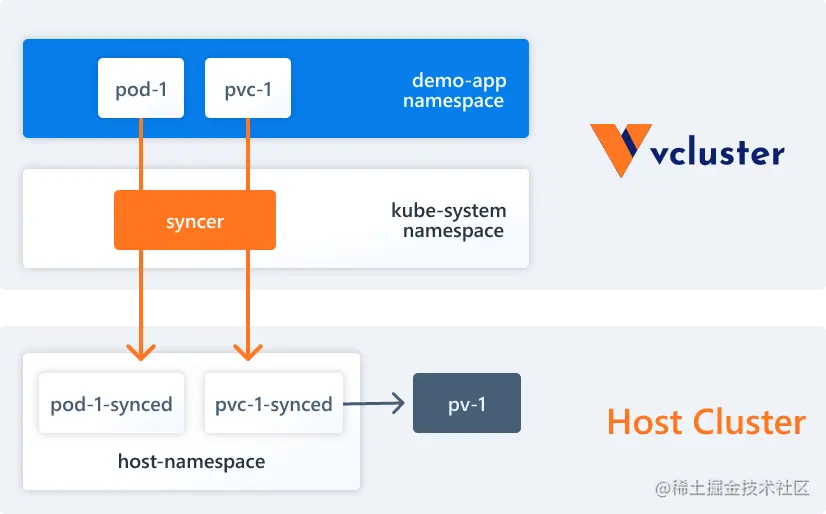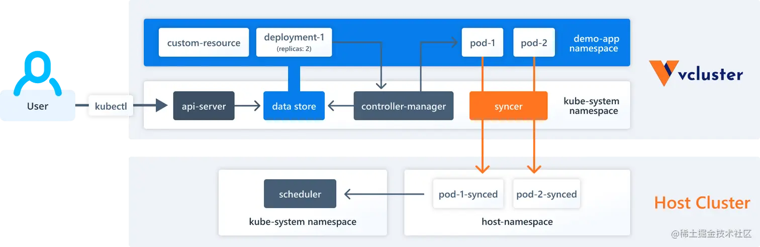 - Syncer 同步器:vcluster 本身并没有实际的工作节点或者网络,它使用 syncer 将虚拟集群中创建的资源复制到底层宿主集群中。