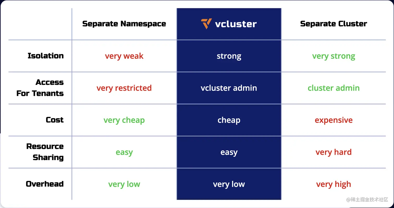 使用虚拟集群相比创建单独的 Kubernetes 集群更经济高效,同时相较于命名空间的隔离方式则能够提供更好的多租户和隔离特性。下表对命名空间、vcluster 和单独的 Kubernetes 集群 3 种方式在隔离性、多租户访问、成本等方面进行了对比。