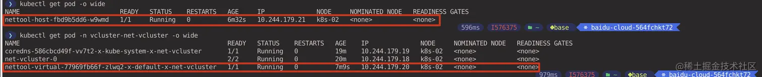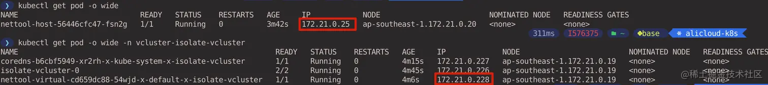 查看在虚拟集群和宿主集群中创建的 Pod 的 IP 地址。(在宿主集群 context 中执行)