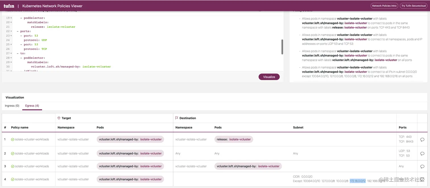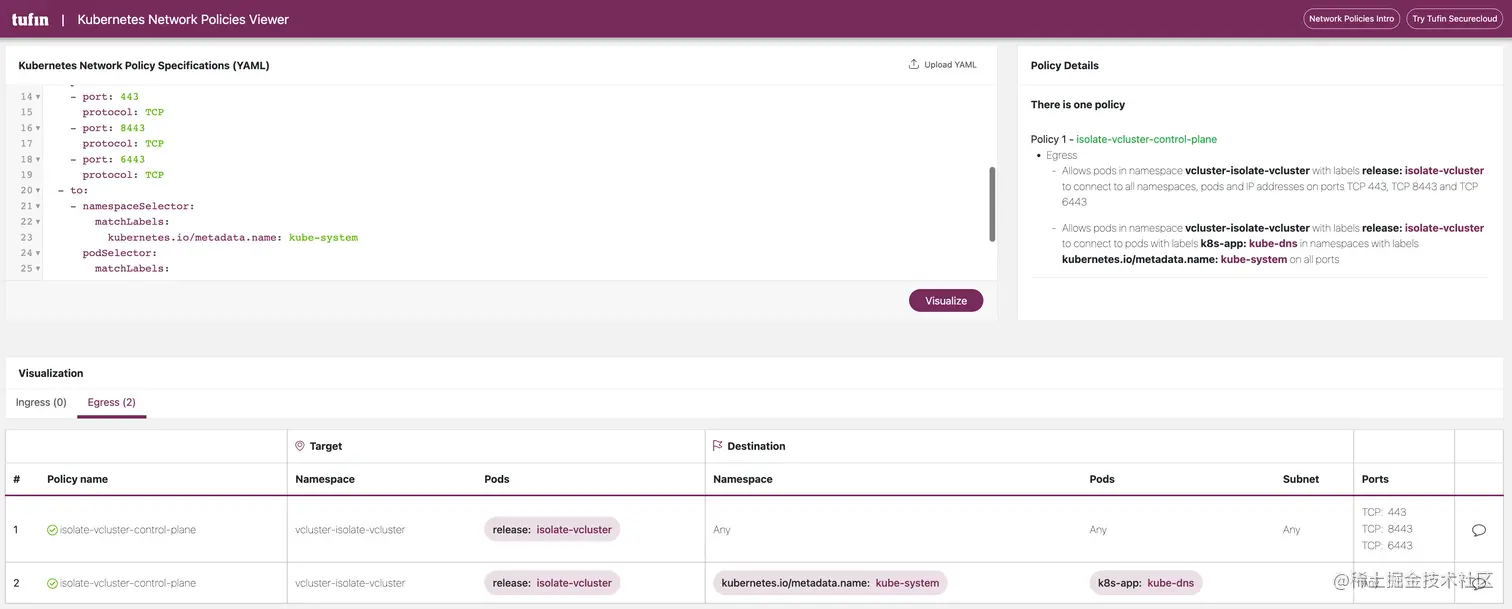 这两条 NetworkPolicy 的 YAML 文件如下所示,可以看到 NetworkPolicy 对虚拟集群的 Egress 方向的流量进行了限制,确保虚拟集群中的工作负载无法主动访问宿主集群或者其他虚拟集群。