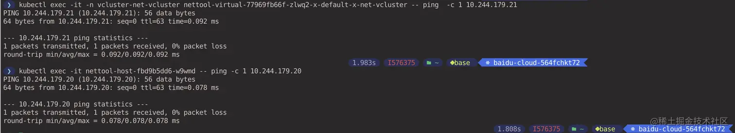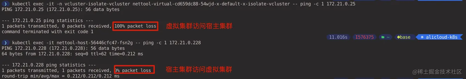 两个 Pod 之间互相 Ping 测试,可以看到虚拟集群无法通过 IP 地址访问宿主集群,但是宿主集群可以访问虚拟集群。(在宿主集群 context 中执行)